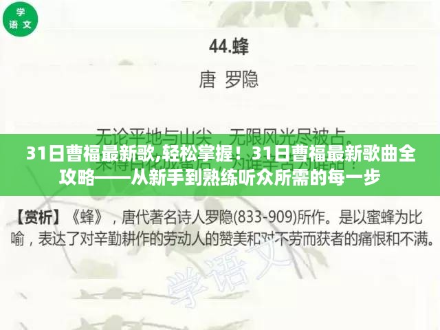 作为音乐爱好者,你是否对曹福的最新歌曲满怀期待?想要深入了解并欣赏这些歌曲,却又不知从何入手?本篇文章将为你提供一份详尽的步骤指南,助你从一个音乐新手成长为对曹福歌曲熟悉的进阶听众,无论你是初学者还是已经对音坛有所了解的进阶用户,都能从中受益。