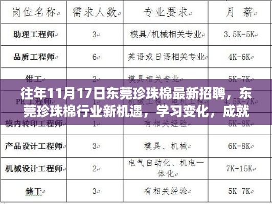 每年的11月17日,东莞珍珠棉行业都会迎来新一轮的人才招聘热潮,让我们一同走进这个充满机遇与挑战的世界,感受学习变化带来的自信与成就感,融入正能量与幽默,共同为梦想加油。