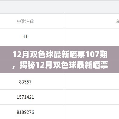 随着年末的脚步日益临近,彩民们的热情也在逐渐升温,本文将为您带来的是关于双色球彩票的最新资讯——第107期的晒票分析与预测,我们将结合历史数据、市场动态以及彩民们的关注度,深入探讨这一期双色球的开奖趋势,让我们一起走进彩票的世界,探寻可能的幸运之门。