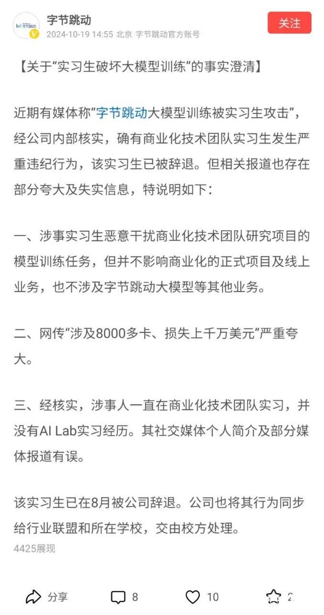 字节跳动在事件曝光后迅速做出回应,表示对此事高度重视,并成立专项调查组进行深入调查,涉事实习生在社交媒体上表示,自己并非故意破坏大模型训练,而是由于操作不熟练导致的误操作,他表示愿意接受公司的调查和处理,同时承诺将认真反思自己的过错并努力改进。