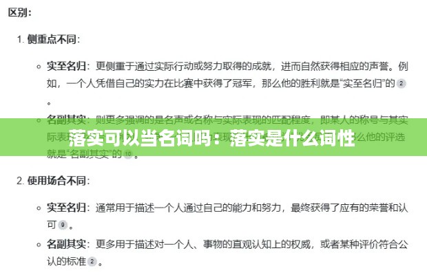 在汉语中,“落实”一词通常作为动词使用,意为“使实现”、“使具体化”或“使成为现实”。它常常用于描述将计划、政策、任务等具体实施并达到预期目标的过程。然而,随着语言的发展和词汇的多元化,有人开始探讨“落实”是否可以作为一个名词使用。